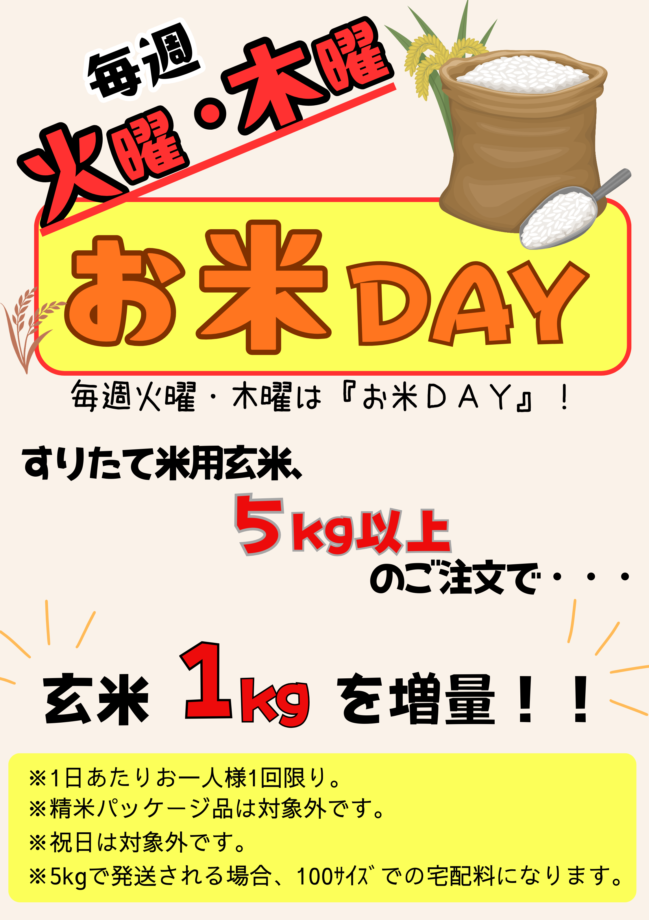 すりたて米用玄米を5kg以上ご注文で玄米1kgを増量!!